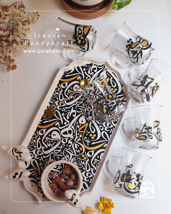 نگاهی به قوری انداختم؛ رنگ دمنوش عنابی روشن بود و عطرش فضا را پر کرده بود. از بین سینیها و استکانهای مامانی، اون ست چایخوری با طرح حروف فارسی طلایی و مشکی را انتخاب کردم. بهنظرم بهترین گزینه برای سرو این دمنوش خوشرنگ و لعاب بود.