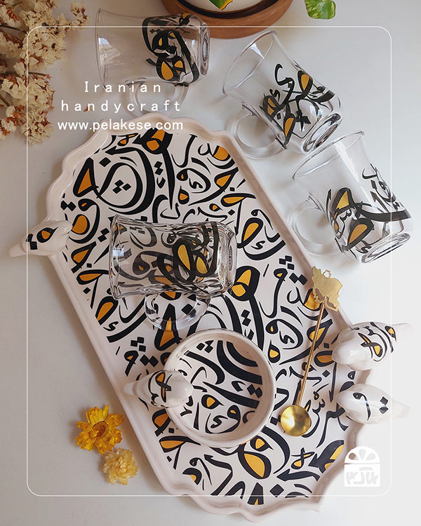 مدل سینی خطاطی با استکانهای دستهدار، هم برای سرو چای، هم شیرینی و میوه گزینهای هنرمندانه و ماندگار است.